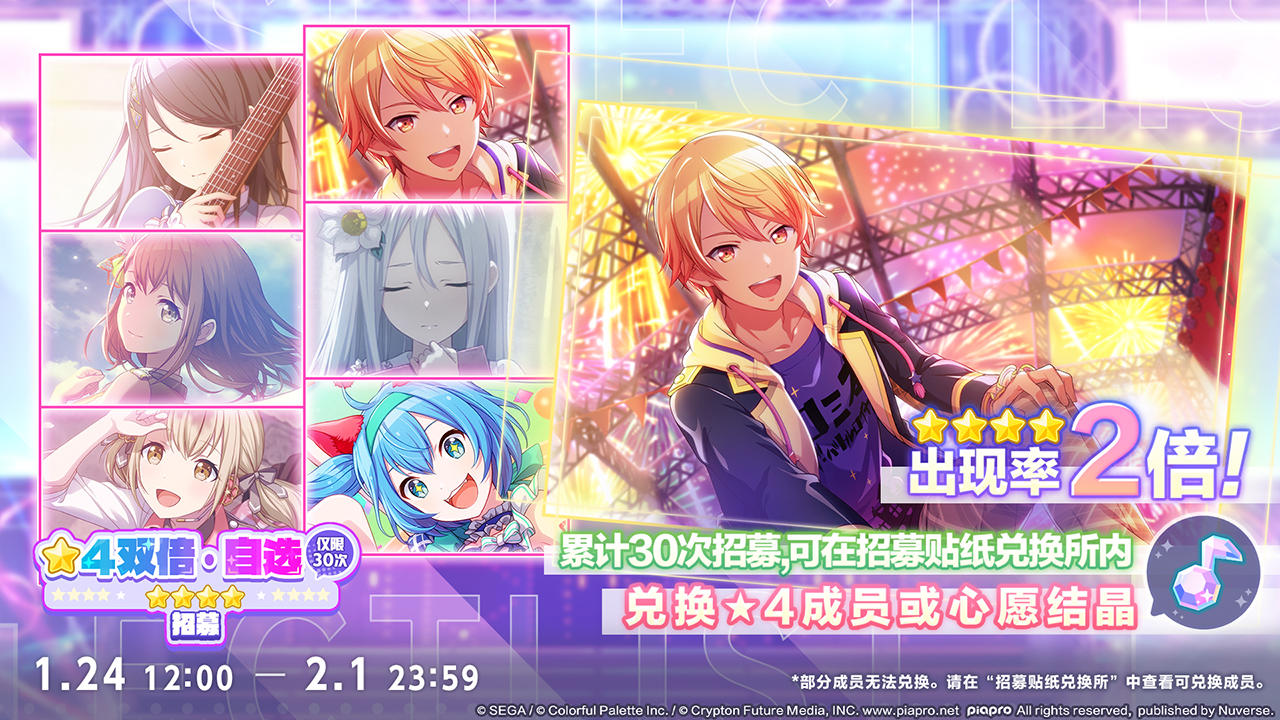 尊敬的各位「世界」居民:1/24 12:00起将举办「仅限30次!★4双倍 · 自选招募」!在「仅限30次!★4双倍 · 自选招募」中,★4成员在各稀有度提供比例的数值变为3%的2倍,达到6%。此外,可在招募贴纸兑换所获得★4成员、心愿结晶。💕【举办时间】1/24 12:00 ~ 2/1 23:59※详情请至游戏内通知查看。今后也请多多支持《初音未来:缤纷舞台》!立即前往「世界」>