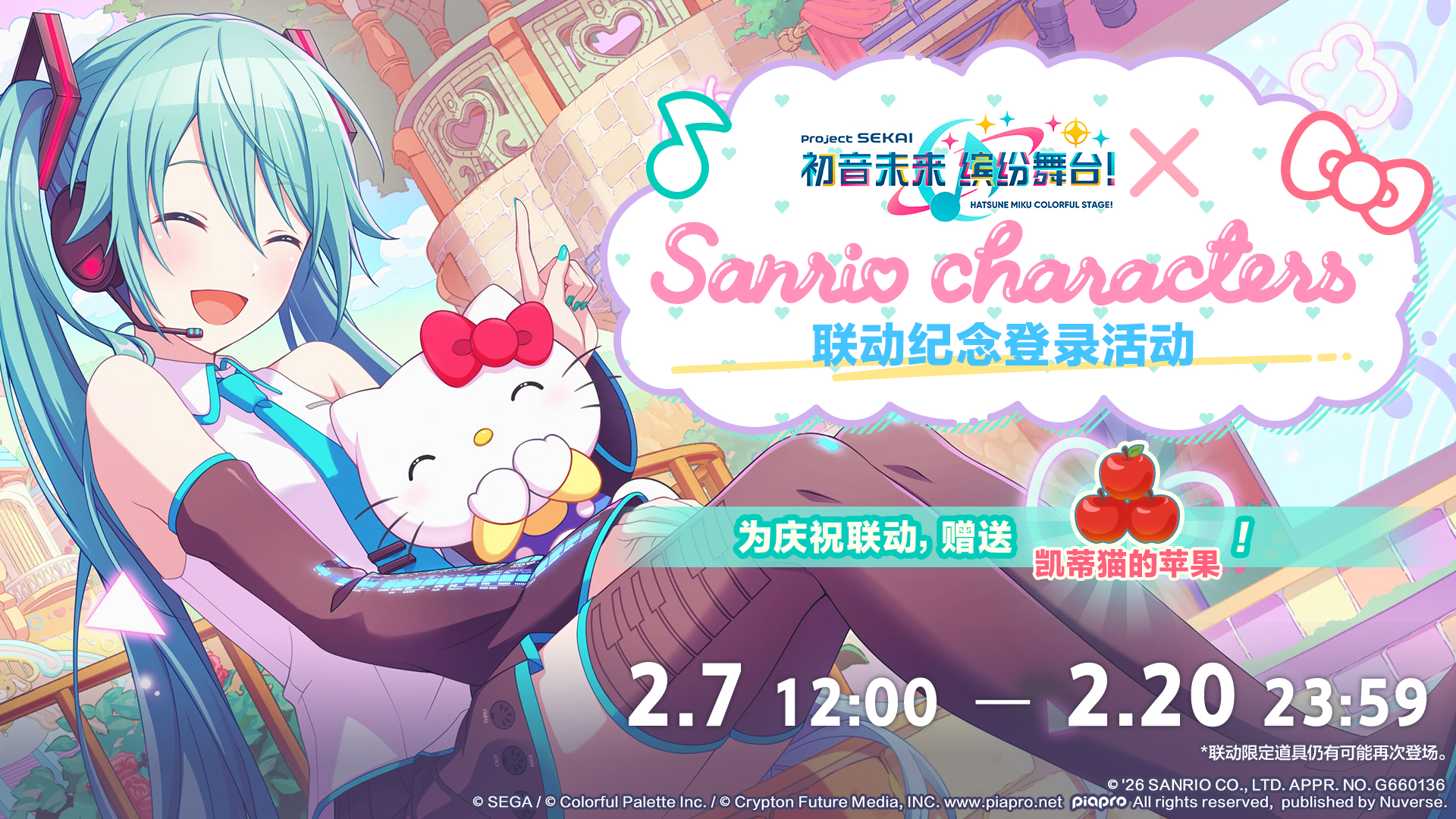 尊敬的各位「世界」居民:2/7 12:00起将举办[初音未来:缤纷舞台×三丽鸥家族]联动纪念登录活动🎀在活动期间登录游戏,即可领取奖励哦💕■举办时间2/7 12:00 ~ 2/20 23:59■活动奖励· 凯蒂猫的苹果(相当于演出能量饮料(大)×1)※更多详情请至游戏内通知查看。今后也请多多支持《初音未来:缤纷舞台》!立即前往「世界」>>>加入官方社群>>>QQ频道:搜索“初