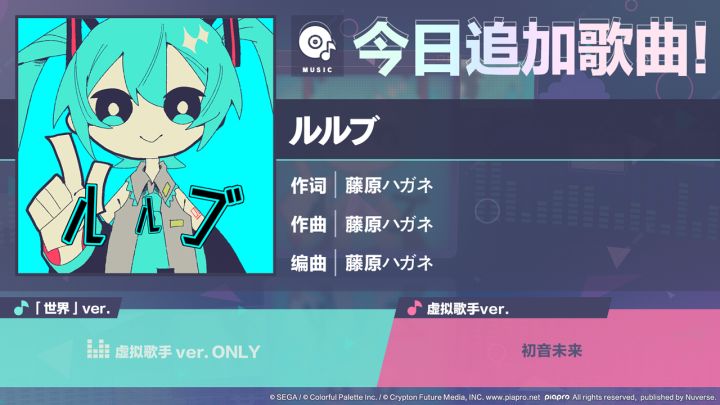 尊敬的各位「世界」居民:感谢各位居民对《初音未来:缤纷舞台》的支持。2/17 15:00起,追加歌曲《ルルブ》!可以在现实世界的「音乐商店」兑换追加的歌曲。■歌曲介绍《ルルブ》作词:藤原ハガネ作曲:藤原ハガネ编曲:藤原ハガネ歌手虚拟歌手ver.:初音未来(Original CV by 藤田咲)今后也请多多支持《初音未来:缤纷舞台》!立即前往「世界」>>>加入官方社群>>>