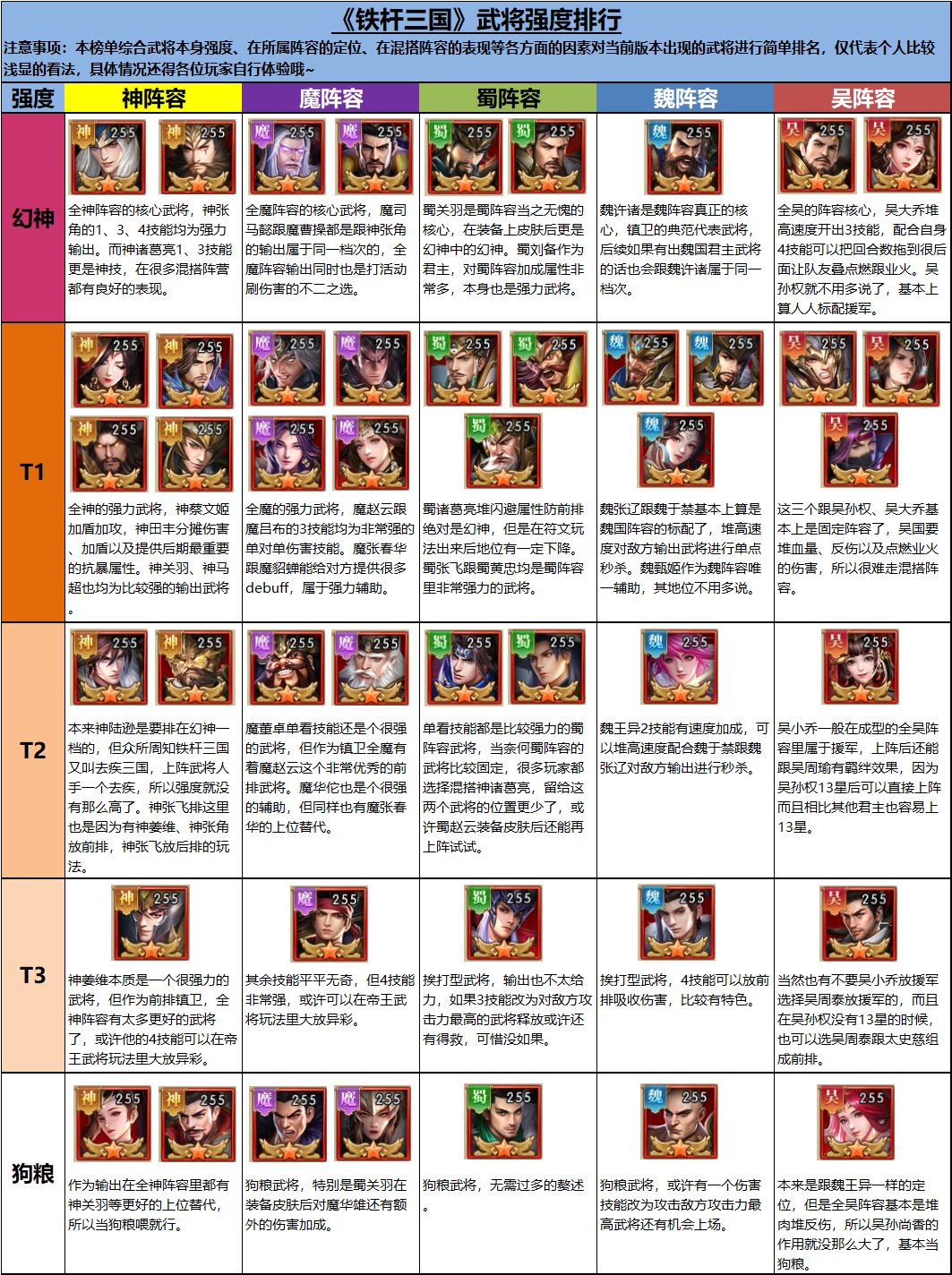 该份攻略转自第三方攻略组,本节奏榜仅供新人开荒使用,从到各个武将的实际强度和表现能力尽量客观和公平分析全武将分阵营推荐,让萌新如何选择武将,少走歪路,快速构筑自己的核心武将成型阵容,渡过新手期。此仅代表第三方攻略组意见,也欢迎各位玩家在本帖提出不同意见和建议哦~