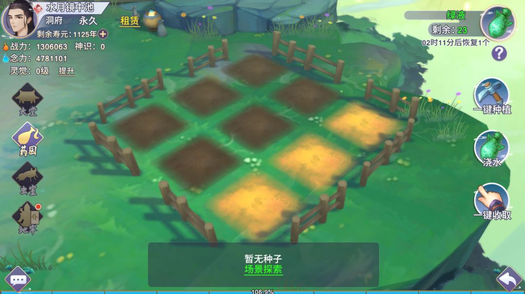 对于修仙之人来说,洞府可谓是重中之重,打坐炼丹都靠它,今天就带道友们看看百里兄自己的洞府到底长啥样。 洞府大堂: 首先是洞府大堂,也是用于提升等级的玩法。 在洞府中可以打坐修炼,提升等级和战斗力,这也是修仙之人必不可少的技能。 另外如果有修炼卷轴的话,可以立即获得60分钟的修炼经验,所以在活动中获得的修炼卷轴,记得要及时进行使用。百里兄目前的等级不算高,等到时候等级高了带你们飞。 药园: 作为修仙