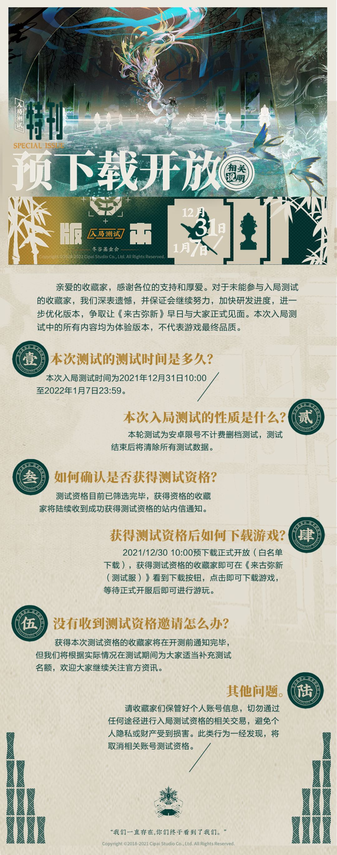 各位亲爱的收藏家: 《来古弥新》入局测试将于今日(1月7日)23:59:59结束,届时服务器将正式关闭,正在游戏中的收藏家将自动退至登录界面。服务器关闭后,我们将清除本次测试所有数据,请各位收藏家知悉。 入局开放至今我们收到了诸多建议反馈,为了能够聆听到更多的声音,冬谷基金会特别开启本次测试最后一次调查问卷。期待您的入局新体验与新心声~ 感谢收藏家们在本次入局测试中给予的支持与帮助,也感谢大家一直