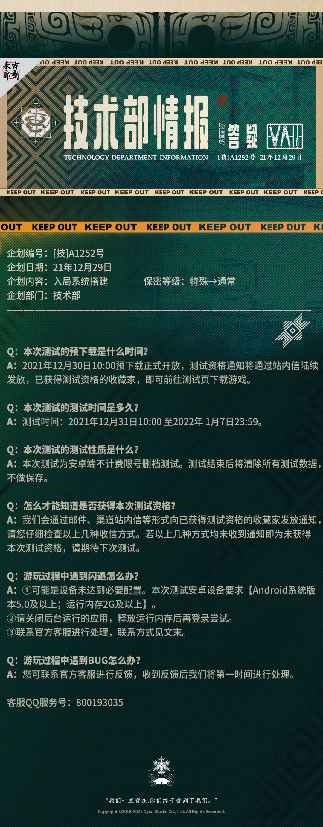 技术部开发企划更新:【入局测试开放前答疑】跟进。 备注:测试资格将于21年12月30日陆续发放,请各位收藏家前往您的站内信进行查看。预下载也将于当日10:00正式开放。资格发放可能出现延迟,感谢您的耐心等待。