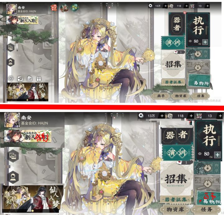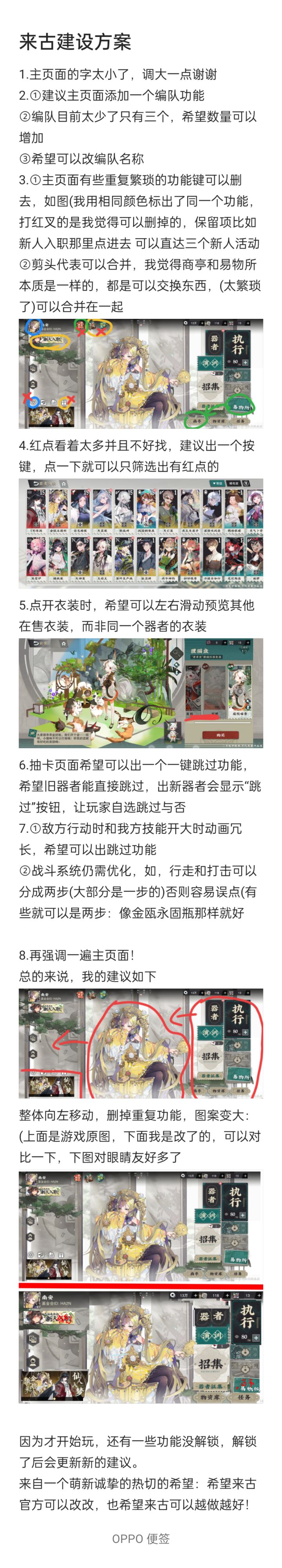 来古建设方案1.主页面的字太小了,调大一点谢谢2.①建议主页面添加一个编队功能②编队目前太少了只有三个,希望数量可以增加③希望可以改编队名称3.①主页面有些重复繁琐的功能键可以删去,如图二(我用相同颜色标出了同一个功能,打红叉的是我觉得可以删掉的,保留项比如新人入职那里点进去 可以直达三个新人活动②剪头代表可以合并,我觉得商亭和易物所本质是一样的,都是可以交换东西,(太繁琐了)可以合并