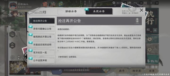 冬谷基金会技术部【入局测试】特别企划 — 入局测试意见bug反馈活动开放。冬谷基金会入局游览开放中!对于再次开启的这段同行之路,我们倍感珍惜,也非常期待听到各位收藏家的声音。收藏家在本次冬谷基金会游览中遇到任何BUG或有任何建议意见,均可按照以下规定格式发布在本贴中。测试结束后我们将在本帖下所有反馈的收藏家中抽取5位送出《来古弥新》周边吧唧*1。意见反馈格式:用户昵称:收藏家用户ID