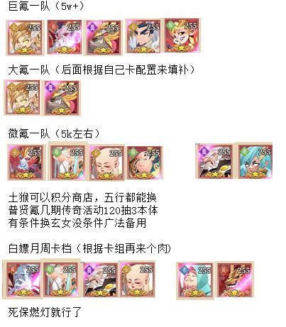 首先别玩纯系!别玩纯系!!别玩纯系!!!重要的事情说三遍,谁玩谁后悔(氪佬当我没说)纯纯大冤种想玩纯系V9起步,别看其它攻略说玩纯火,都是骗人的,你要玩你就是真的纯火(蠢货)不是纯系不强是你根本养不起,资源根本不够平民微氪都给我老老实实的玩五系或者四系,到大后期再考虑转系,接下来说说平民微氪党的推荐阵容这边建议最好可以刷一个有燃灯或者太乙的号开局,别看有个资质15/16的就玩了,你前