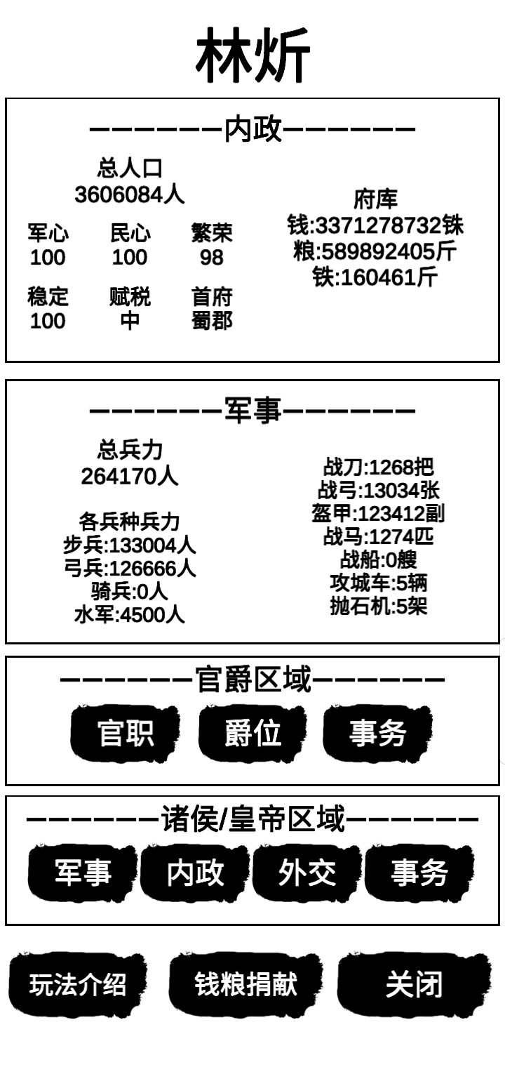 这次更新的第二版,可以说是非常简单,仅需三天的零散时间,就可以从官员到一方诸侯,只需要把开局给了钱和自己身上的钱,全部都拿去用于贸易,再把官员的工资,从往家族资产里加,改成直接加到自己上面,然后就可以开始一直在贸易,每次贸易成功都会给你几千或几百或几十,嗯,最好就是去东洋,搞三个商队,都去东洋,选十个商队成员,40个护卫,就可以纵横东洋,最后只需要慢慢肝钱就好,每个商队最多就拿50万,一次可以赚个八九万,这是在没有风暴和被打劫的情况下,最后把钱刚好做就买武力丹,体力丹和战功丹,功勋丹和名望丹,最后肝上大将军和王就行了,目前我只拿下了益州和荆州,还没统一,等后面统一了,再做详细的教程,还有每个月会减少10点的健康,前期经商的钱可以拿一部分来治病,等到后面升到了第二的官,就可以把父母饿死,减少粮食消耗,等粮食攒多点,你就可以拿去卖,然后买农田,农田前期是不赚钱的,要慢慢涨,到100亩左右就可以不用管它了,另外打城池的时候,最好选择那种比较有钱的,比如益州的蜀郡