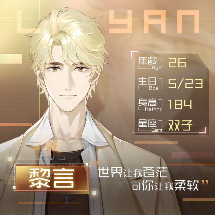 个人档案:姓名:黎言年龄:26岁身高:184CM生日:05/23星座:双子座职业:希镜城·全知数据中心·首席数据师黎言的目光越过休憩区大堂里一团糟乱的嘉宾和记者,看向正在向其他记者请教问题的你。当看到你假意虚心向人请教问题后转身便眉目横锁的表情,他忍不住漾起了温润的嘴角,觉得自己应该没选错人。从海量的晋级记者中看到你的材料时,那种让他眼前一亮的触觉,同此刻如出一辙。只是他一时绽开