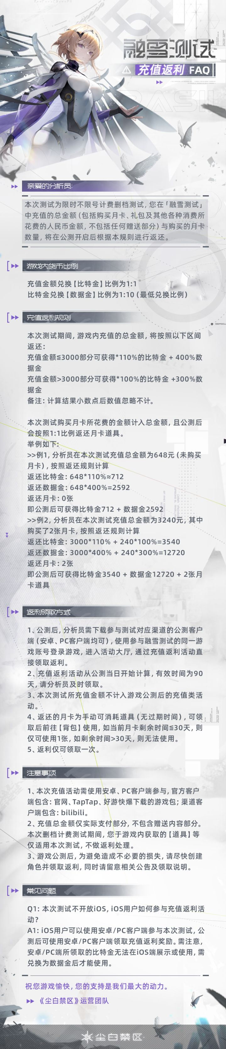 本次测试为限时不限号计费删档测试,您在「融雪测试」中充值的总金额(包括购买月卡、礼包及其他各种消费所花费的人民币金额,不包括任何赠送部分)与购买的月卡数量,将在公测开启后根据本规则进行返还。