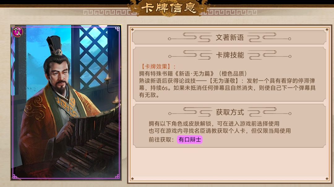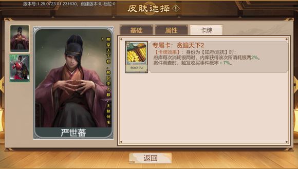 文官篇: 严世蕃 专属卡:贪遍天下 身份为【知府/巡抚】时: 府库每次消耗银两时,内库获得该次所消耗银两1%。 案件调查时,触发收买事件概率+5%。每回合善恶值+3。 评析:意思是衙门消耗一万两,主角就可以获得一百两,巡抚每年功勋怎么说有一万,可以换一百块物资令,每块物资令可以换五万两,一年就是五百万两,如果五百万两全花完,主角可获得五万两;并且如果完成嘉靖剧情模式获得贪遍天下进阶令,内库获得得银