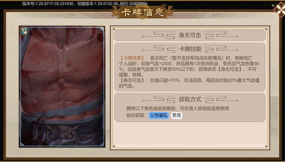 专属卡推荐(角色推荐): 贯高: 专属卡:身无可击 介绍:个人站有一次免死机会,气血增加2000,免死后气血回复+50%,自身气血首次低于50%时,获得《身无可击》状态,不可解除。 《身无可击》:闪避+70%,无法回血,每回合扣除20%的最大气血值的气血。 但是这张卡对队友也是有效果的,搭配沐府思***的《烛心毒蛊》,无限召唤,完全是天下无敌。 费长房: 专属卡:竹仗化龙 介绍:初始拥有道术属性和