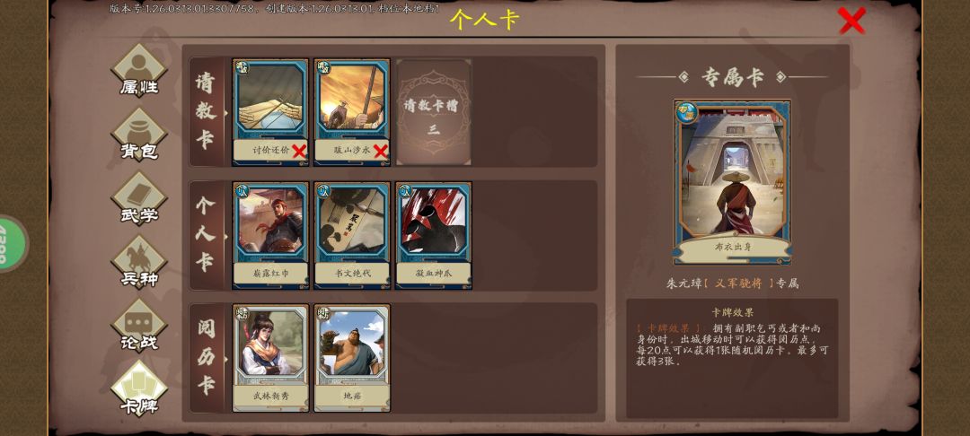 还是熟悉的配方 大佬就请无视吧[表情_叹气] 项羽卡 霸王举鼎 武力值增加上限120 基本上必选的金卡 吕布金卡 有勇无谋 个人也是每次必带的金卡 勇闯少林 绿色卡 个人觉得过岁月卡 少林必备的 有钱就可以买武功超省时间 虎体狼腰 蓝色卡 [个人评价蓝卡品质 金色属性我基本上都带] 天下奇男子 紫卡 喜欢就带着 反正我个人推荐带着 纵横盘击 最近获得的蓝卡 对于拳法很友善 看需求 有需要就带着