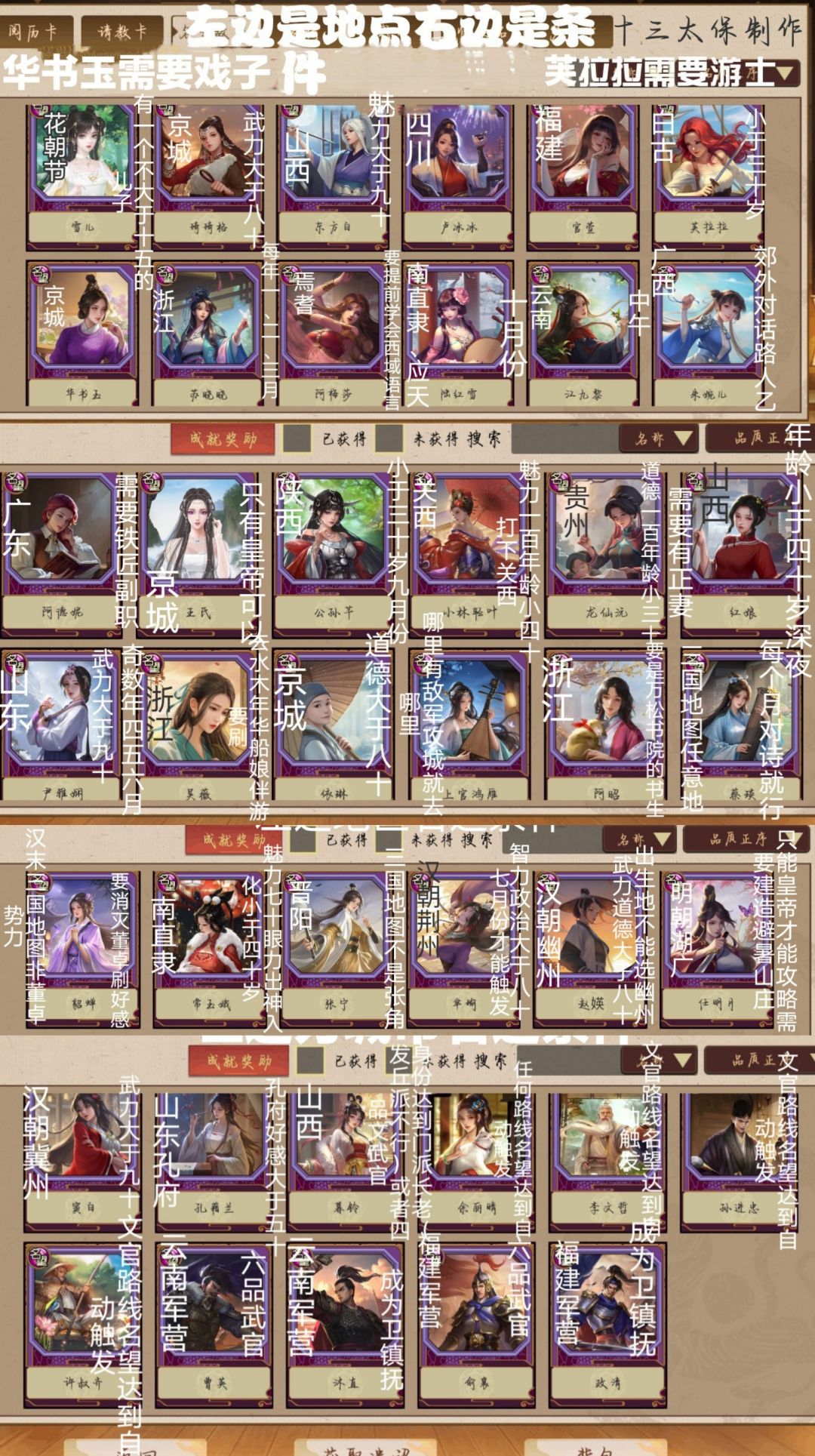 观前提示: 1、已按朝代-区域-城市划分完毕,明朝请看图1-6,三国请看图7,汉朝请看图8。保存图片后,查看更清晰。 2、表格中,触发地点、触发必备条件为触发条件。前期准备为可攻略下来的条件:文字前带*的不是必要条件,只是个人攻略时认为更方便/更快的条件;文字前不带*的为必要条件,如果无法触发/攻略,请检查必要条件是否遗漏。 3、本攻略更适用于解锁剧情妃,以便开新的一局入局可带。非解锁为主,而是长