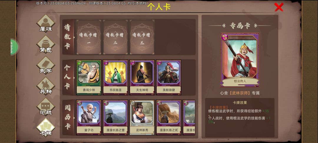 还是熟悉的配方 大佬就请无视吧[表情_叹气] 项羽卡 霸王举鼎 武力值增加上限120 基本上必选的金卡 吕布金卡 有勇无谋 个人也是每次必带的金卡 勇闯少林 绿色卡 个人觉得过岁月卡 少林必备的 有钱就可以买武功超省时间 虎体狼腰 蓝色卡 [个人评价蓝卡品质 金色属性我基本上都带] 天下奇男子 紫卡 喜欢就带着 反正我个人推荐带着 纵横盘击 最近获得的蓝卡 对于拳法很友善 看需求 有需要就带着