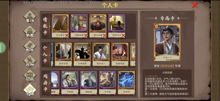 我又又又又回坑了,上次回坑,居然是三年前了,哇,时间过得太快了吧。我这两天都在跑商,太爽了!刚刚把西域图奉上,当了县令,和大家分享跑商经验。给大家隆重介绍一下请教卡!原本我只能带商队距离1经商,但是在角色17岁那年,我寻思给他成家,但是又不知道选什么妻子。我就想着看看她们的卡牌吧,结果一点开,第一个就是缘分啊,跋山涉水!作用是,角色所有身份出行距离+1!这真的是跑商最强技能!住宅的驿站