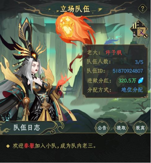 1、在修仙路上可以根据立场:正义、中立、邪恶组建专属队伍,每个队伍最多人数上限为5人,由老大每周根据队伍成员贡献值,进行队伍收益的分配,队伍贡献值越高,分配得到的收益就越高。2、老大位置队伍成员可以进行弹劾,更换老大,当队伍出现利益分配不均时,也可以通过脱离原队伍,重新寻找成员组建新的队伍。3、在立场队伍中,可以擒拿敌对立场玩家来帮自己队伍进行灵石的挖掘,擒拿越多敌对立场玩家,收获的灵石产出就越