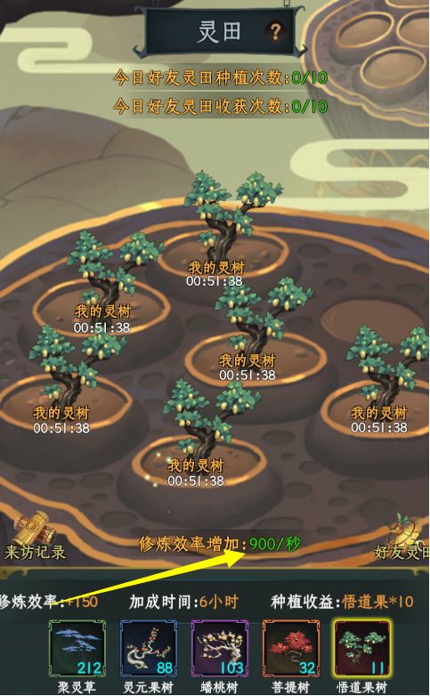 灵田主要增加秒产和产出炼丹的材料种植灵田可增加修炼效率,灵气获取就会更快,品质越高的果树加成修炼效率就越多,同时收获的果子用作于炼丹材料要注意的是,如果好友帮你种植的,你收取后的果子会返还给你好友,在此期间你是可以享有秒产“经验加成”;如果好友帮你种的种子比较差,可以选择铲除重新种;