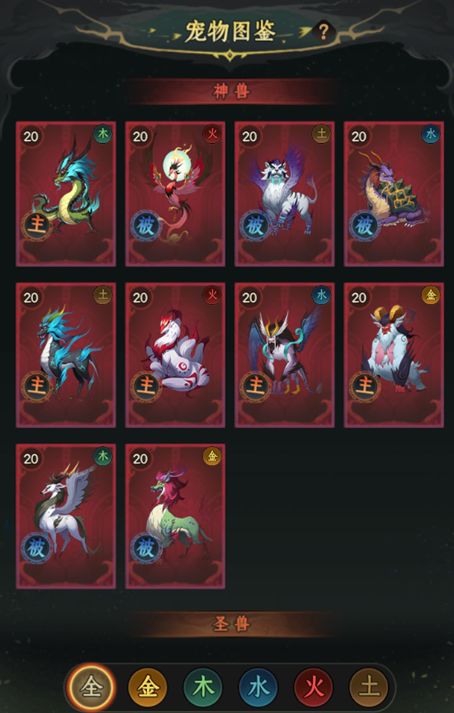 一、基本概念进入宠物界面,在宠物图鉴中可以预览所有宠物。宠物的品质由高到低分为神兽、圣兽、仙兽,建议优先培养品质更好的宠物。从属性区分可以分为金、木、水、火、土这五种属性,金系注重攻击,木系注重回血,水、火两系注重暴击,土系注重防御。可以根据情况上阵不同属性的宠物。所有宠物上面都有标注“主”和“被”,标注“主”的宠物出战技能是主动技能,标注“被”的宠物出战技能是被动技能。人物每次战斗只能上阵