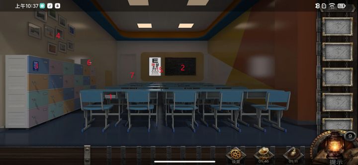 闯关顺序如下:1、点击移动书桌中的书本,拿到黑板擦2、使用黑板擦,点击黑板,黑板上只留下一条线索:9/X=X*13、根据公式得到密码9331打开柜门,拿到一张带有4种颜色的纸条4、根据拿到的四色纸条,依次观察墙面的照片墙,可以发现4个颜色外框的照片上的4组数字:1895、3968、5675、66935、观察视力表发现线索,有4个红色,依次对应刚才得到数字组上的数字6、结合纸条颜色,照片墙