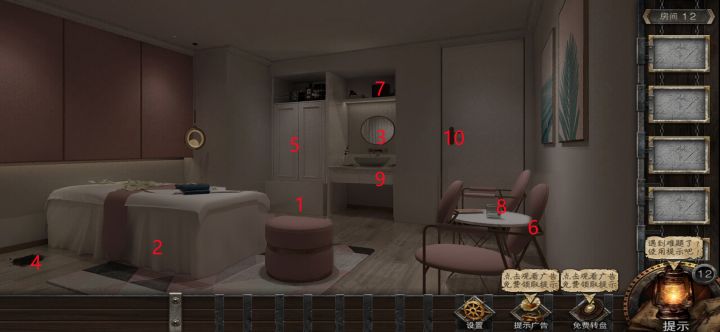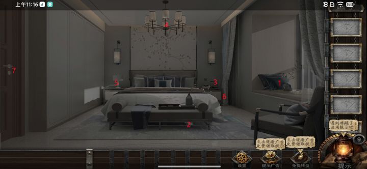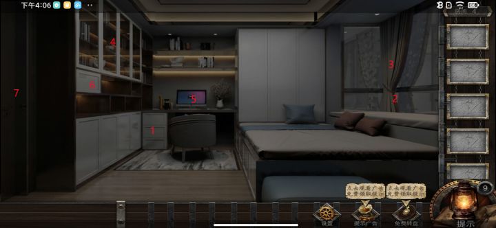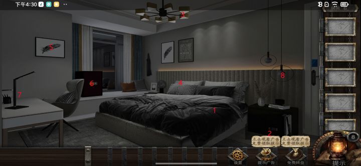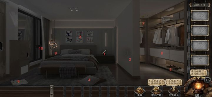 闯关顺序如下:1、点击并移动抱枕,拿到道具“钩子”2、使用钩子,把钩子深入到床尾的凳子底部,勾出开关3、把开关修复好,打开开关,点亮屋顶灯4、观察点亮的屋顶灯,只有四个是亮的,其他是暗的5、在打开床头灯,床头灯的周围会出现投影数字6、根据投影的数字结合吊灯亮起的灯泡位置,获得密码3108,点亮对应的数字,打开柜门拿到钥匙。(密码不分先后顺序,所有按键都可点亮,点亮4个正确的即可解锁成功