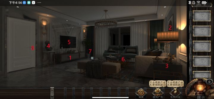 闯关顺序如下:1、打开柜门拿到喷雾2、对着壁画使用喷雾,壁画上的数字出现变色(27814)3、根据壁画变色字位置点亮对应按钮,打开柜门,拿到锤子,可选中和取消选中,全部选中正确才开门4、使用锤子打碎塑像,拿到塑像内的遥控器5、使用遥控器打开电视,获得线索A=16、根据A=1解锁手机,并获得新线索(3427)7、根据手机屏幕线索,点亮对应符号解锁箱子(左上、左下、右上、右下),拿到钥匙