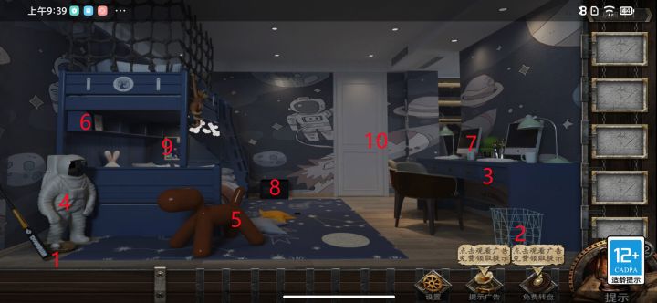 闯关顺序如下:1、撕下棒球棒上的白色贴纸,露出棒球棒上的字母D6B3F5C4A12、拿到垃圾篓中的纸团,道具栏查看展开的纸团上有个数字和字母的表格3、打开抽屉拿到小刀4、使用小刀划开宇航员服前面,拿到充电宝(带线)5、使用充电宝为地上的手机充电,手机开机,屏幕上出现可触碰的方格,方格触碰会变色再次触碰恢复初始状态,全部点击正确即可解锁手机,手机屏幕会变为新线索4只动物6、移动墙书架上的