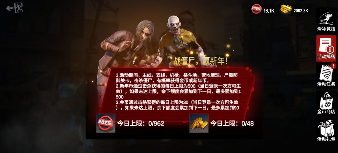 游戏简介 《僵尸前线3D》是“僵尸前线”(Zombie frontier)系列最新一代作品,由U3D引擎深度设计打造,大大提高了游戏画面质感,使场景更逼真,令僵尸“活”起来,让玩家真正享受射击游戏的乐趣。全新活动即将到来,僵尸前线世界将开启为期12天的节日活动。 1月9日8点至1月21日8点,僵尸前线世界将开启为期12天的滑冰竞技活动。 获 取 1、通过主线、支线、防守、格斗场和营地战斗,消灭僵尸