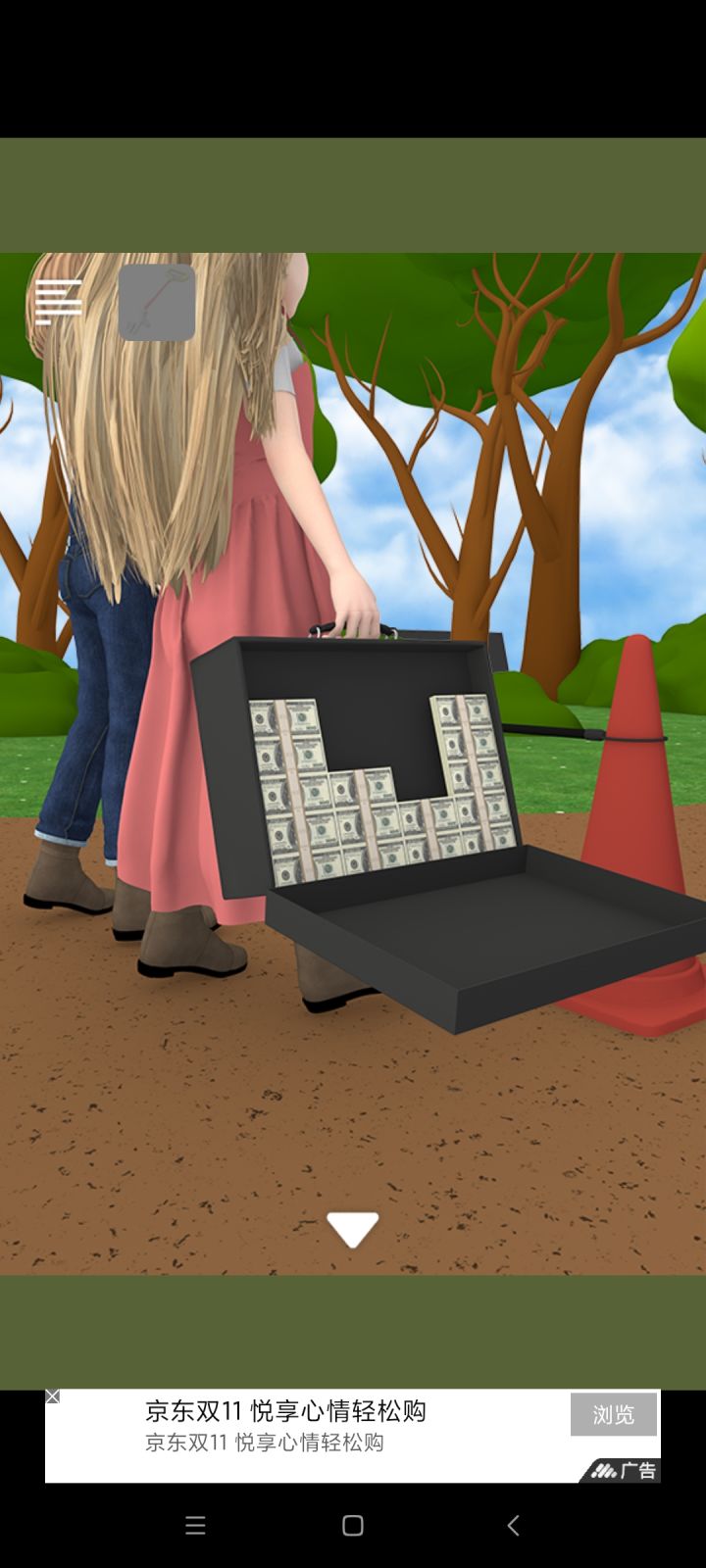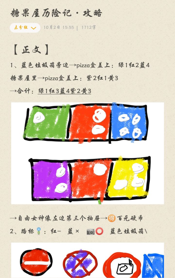 根据甜甜圈的顺序打开信箱得杠铃,杠铃压在垃圾桶的脚蹬上得小刀,小刀划破旁边纸箱得门把手根据卖饮料机器闪光--左右左右中中,按顺序点做甜筒的把手,有2褐1蓝根据女巫手中1白,女神像手中1褐,白马头顶1蓝,白屋房顶1蓝,共有3蓝3褐1白,打开小女孩手中箱子得草莓和巧克力撕开巧克力的包装,按颜色打开取款机下方的箱子得榨汁机,把草莓放进去榨汁根据标志箱子得刷子,刷上草莓汁把照相的那个标志涂成禁止门