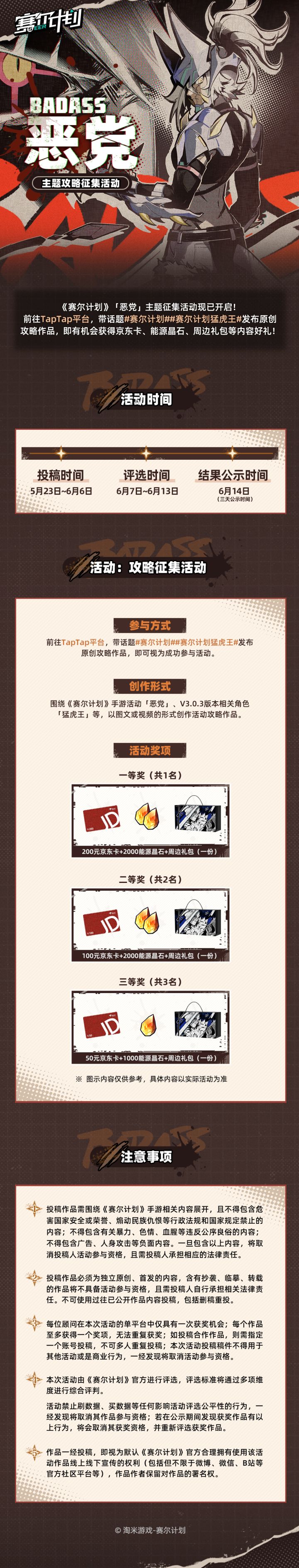 《赛尔计划》「恶党」主题攻略征集活动现已开启!前往TapTap平台,参与发布原创攻略作品,即有机会获得京东卡、能源晶石、周边礼包等内容好礼! ★活动时间:5月23日~6月6日 ★参与方式:活动时间内,前往TapTap平台,带话题#赛尔计划 ##赛尔计划猛虎王 #发布原创攻略作品 ,即可视为成功参与活动。 更多活动内容详情,点击下方长图进行查看~
