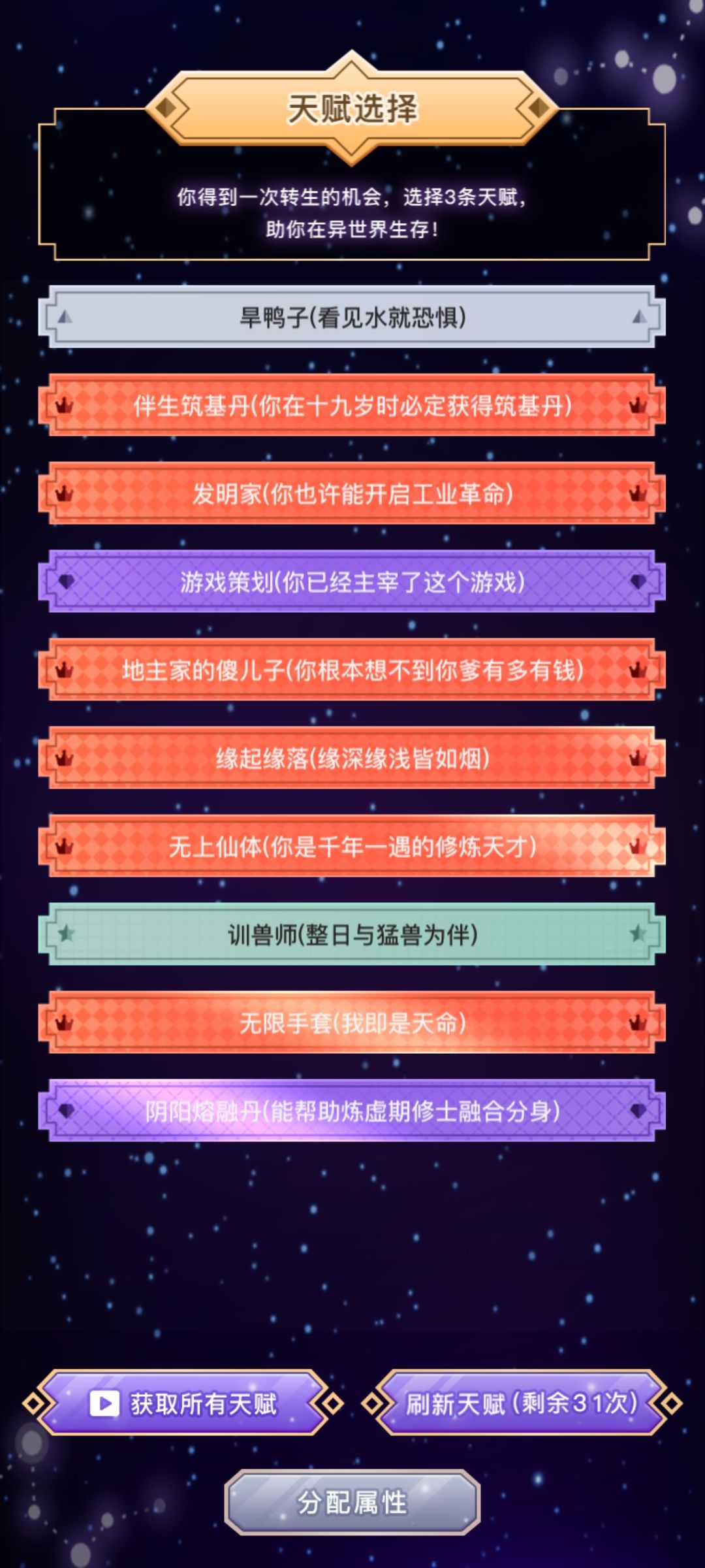 橙色天赋: 1.无上仙体 1岁触发:全属性增加; 4岁触发:修为+3; 16岁触发:力量+3,敏捷+3,体质+3,修为+3; 40岁触发:修为+5; 2.地主家的sha儿子 1岁触发:家境+15; 3岁触发:智慧-4; 3.无限手套 5岁触发:家境+3; 20岁触发:家境+3; 45岁触发:家境+10; 48岁触发:家境+2; (100岁前未结丹大概会在60左右触发一次,修为+8,记忆有些模糊了,