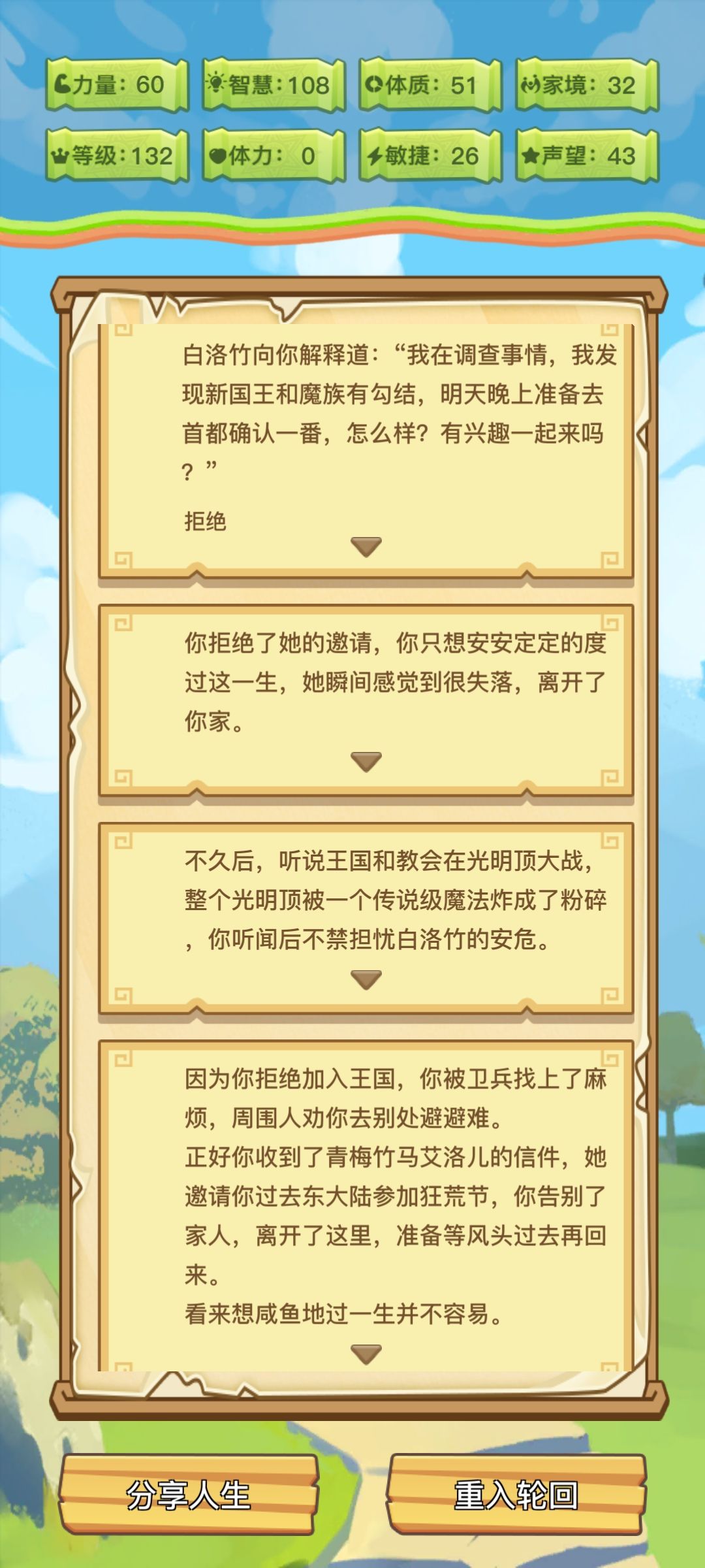 打通完美结局了,有一些心得分享一下 先说橙色天赋,开局如果想打舒服了,无极仙体,天魔心,筑基丹最好有一两个。bug随机加属性,无限手套加家境,锦鲤附体加运气提供一些属性优势,也是前期天赋。连心蛊和缘起缘落分别有两个支线,漓尘和迦南王如烟这俩人结局都不太好,不过按剧情线过能得到额外的属性提升。发明家天赋是后期通关神级天赋,如果等级能轻松打到大乘期后有必拿。 首先,33岁前筑基和白洛竹见一面,无极仙体