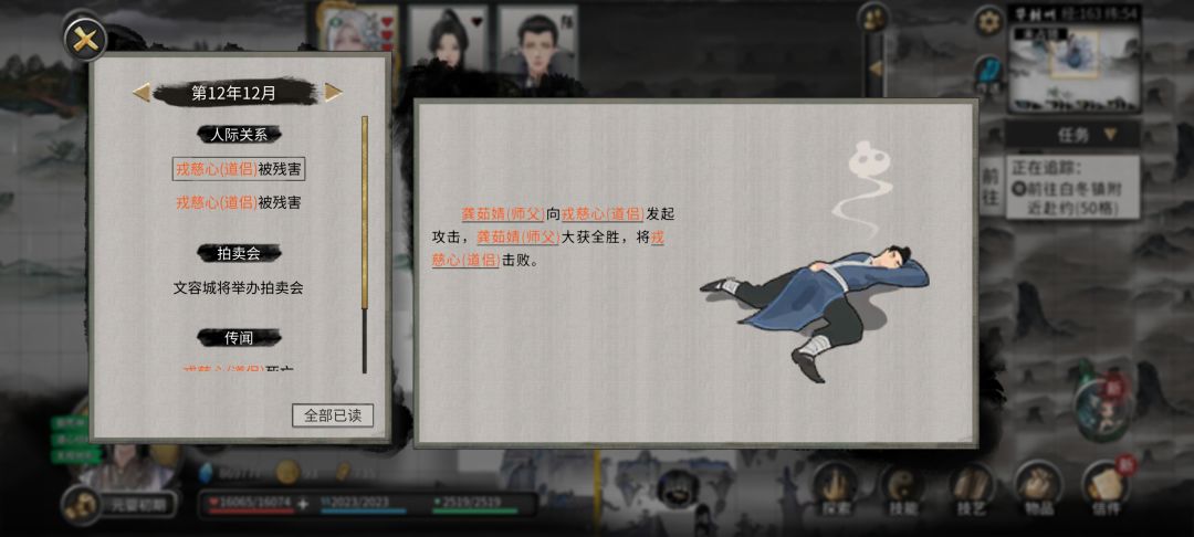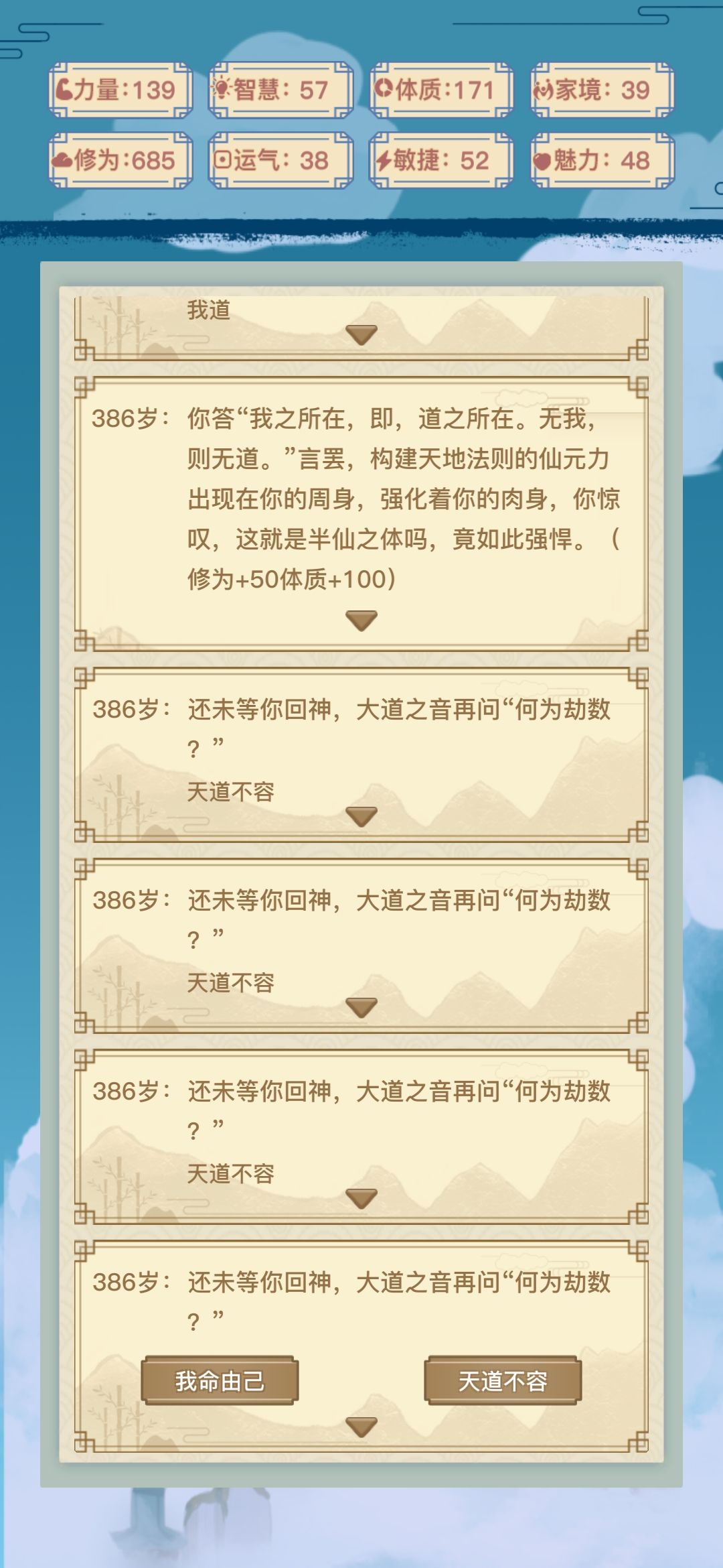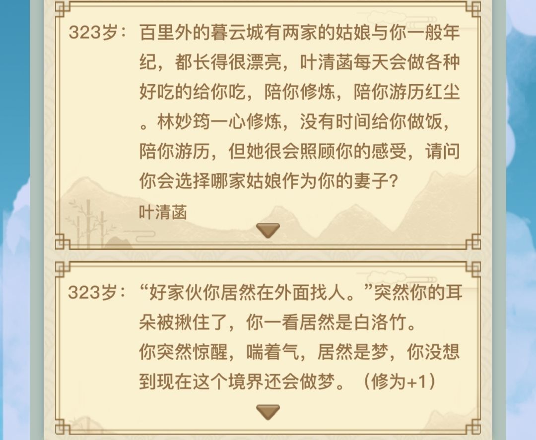 今天玩的时候发现游戏更新了新剧情,其实是我太久没玩了(bushi)。 说一下(个人觉得)事件最优选项和部分事件详解 1.路遇老人:扶(修为+1),治疗(魅力+1) 2.真假山庄寻路:选左边(智慧+2),选右边(智慧-2) 3.陈塘堰大旱:惩治(魅力+2,修为+1),劝诫(修为+2) 4.暮云城选姑娘(其实是做梦):林妙筠(修为+1),叶清菡(修为+1) 5.遇到鲤鱼:吃鱼(修为+2,运气-2),放
