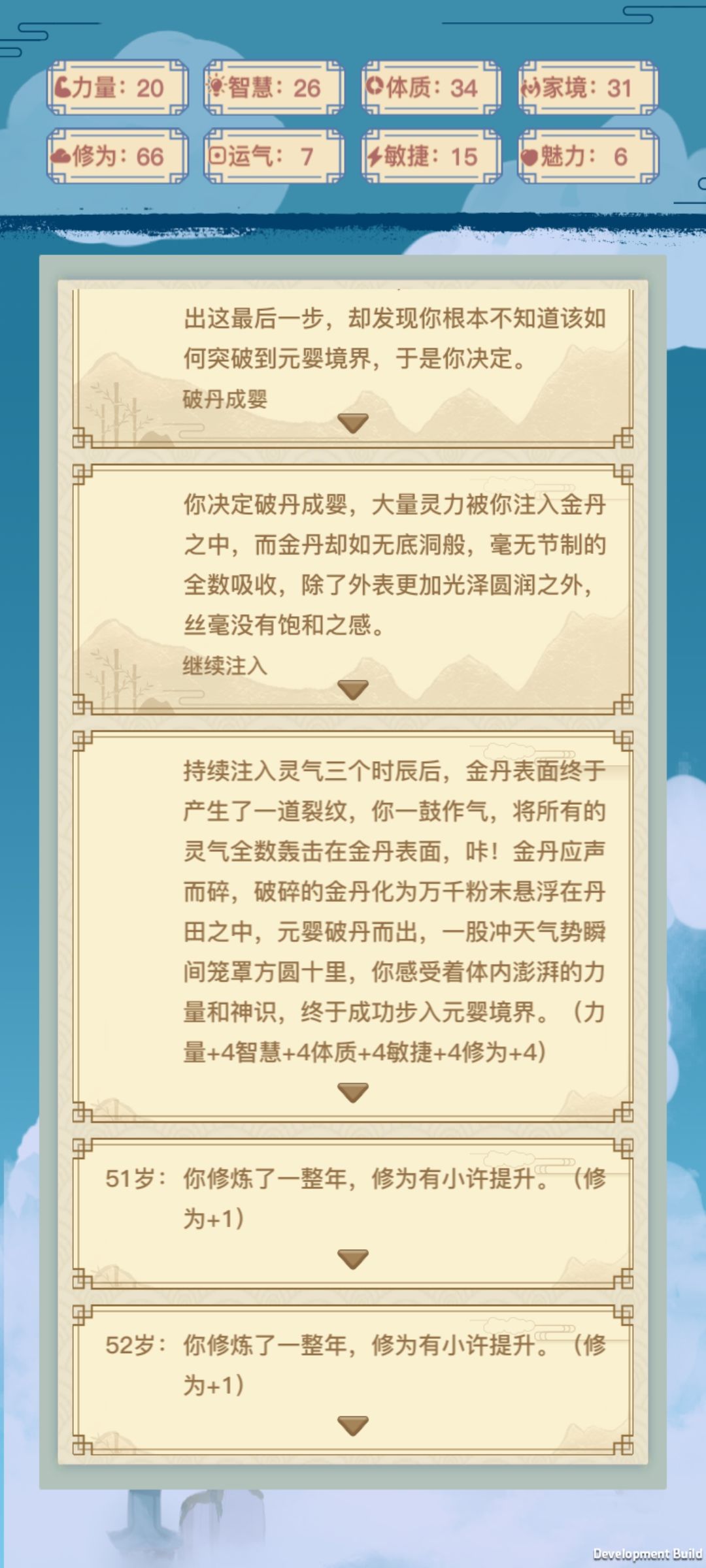 事件选项我就不多说了,首先本款游戏要想要渡劫必须要有足够的天赋点。所以我们要做的就是刷点数,目前还不能达到渡劫的同学就需要在天赋中选出紫色的天赋(逍遥坊黑卡会员)推荐加点10力10智10体力家境有多少点多少。 准备好后进入游戏我们需要在每个森林中提升自己的修为,用家境换修为, 40岁 的第一个森林力量达到15就可以打败烈火马,在这个阶段尽量刷到40修为。如果还有家境的同学可以在后续森林继续刷家境,