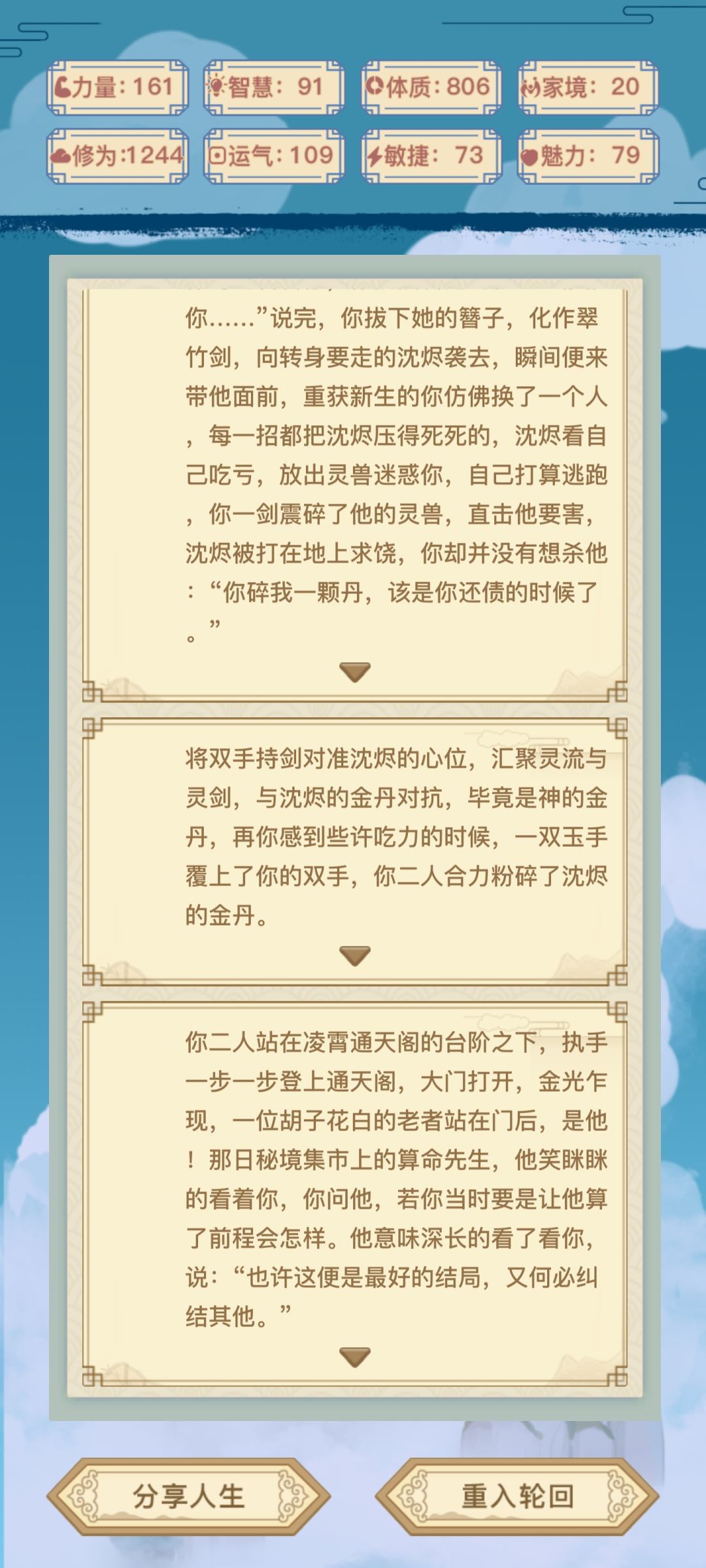玩了三天,看了各种攻略,终于把完美结局肝出来了,说一说自己对这个游戏的理解吧(个人只玩修仙)。 基于武侠修仙世界的背景,融入了各种搞怪元素,比如“我不要白嫖”“厚礼蟹”都非常出圈,游戏中可以选择的天赋也是非常丰富的,总体而言是一款不错的文字游戏,如若你对仙侠世界有情怀的话一定要尝试这款游戏,血赚不亏。 再讲讲如何才能顺利活到800岁大关吧。我认为重要的是注意以下几点: 1.天赋选择:个人认为,好的