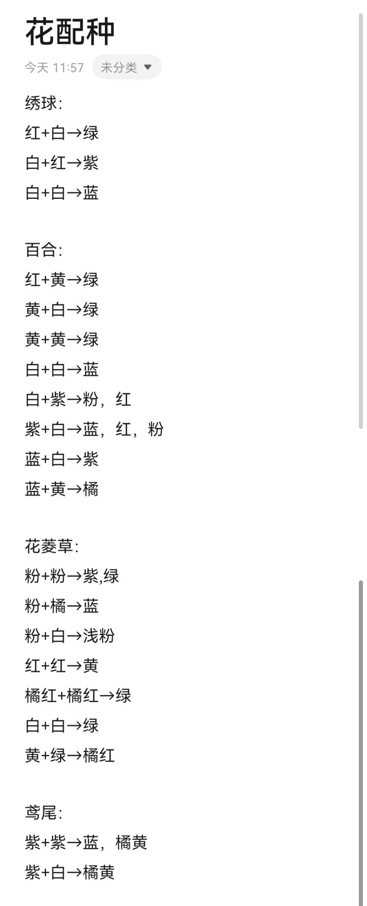 花配种的规律,根据目前已有信息,猜测应该是在固定搭配中有低概率变异、稳定变异和遗传亲本三种可能性,在这里开一个花配种的收集帖,大家有配出亲本1+亲本2→变异花3这种情况,可以留言告诉我,我整理噢!