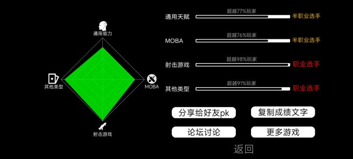 我在[我的游戏天赋]中的成绩:通用能力超越91%玩家 -相当于职业选手MOBA游戏超越95%玩家 -相当于职业选手射击游戏超越76%玩家 -相当于半职业选手其他类型超越68%玩家 -相当于主播代练