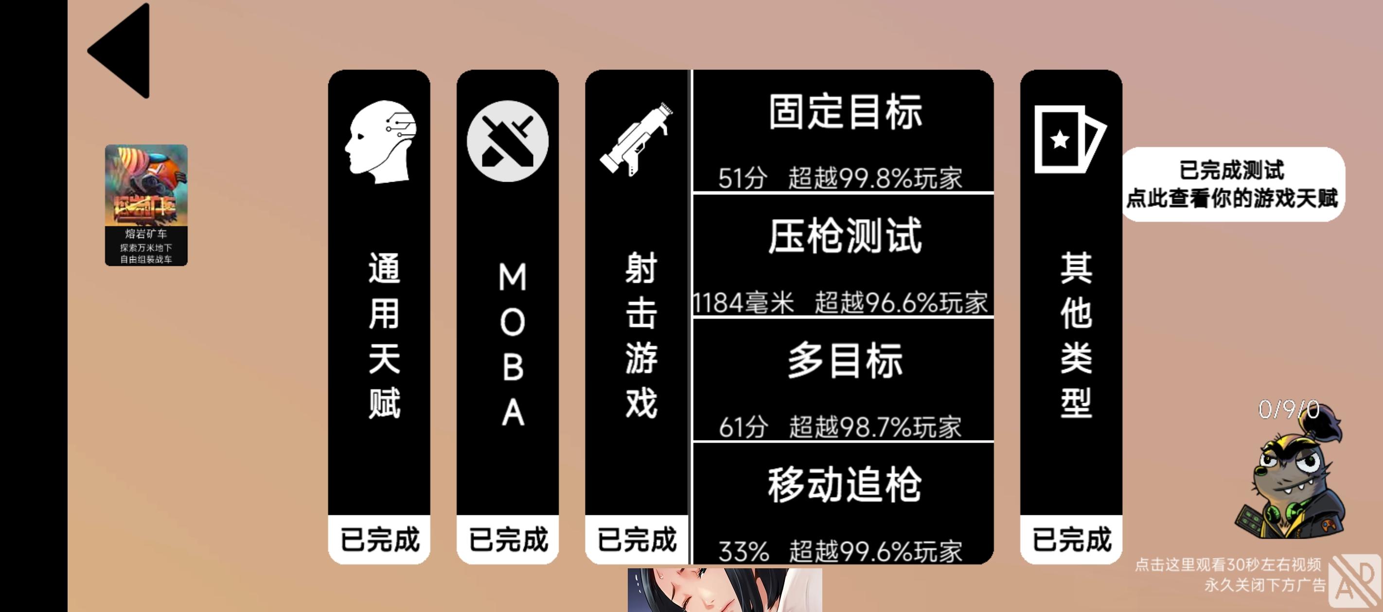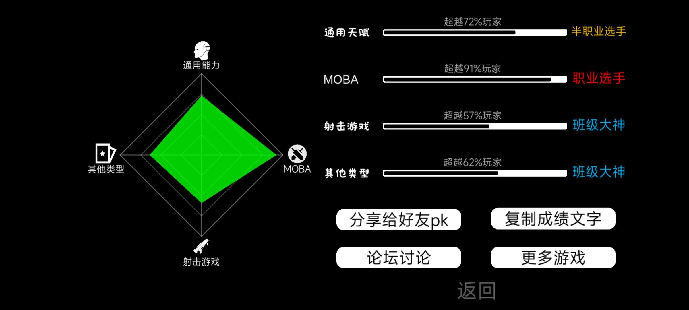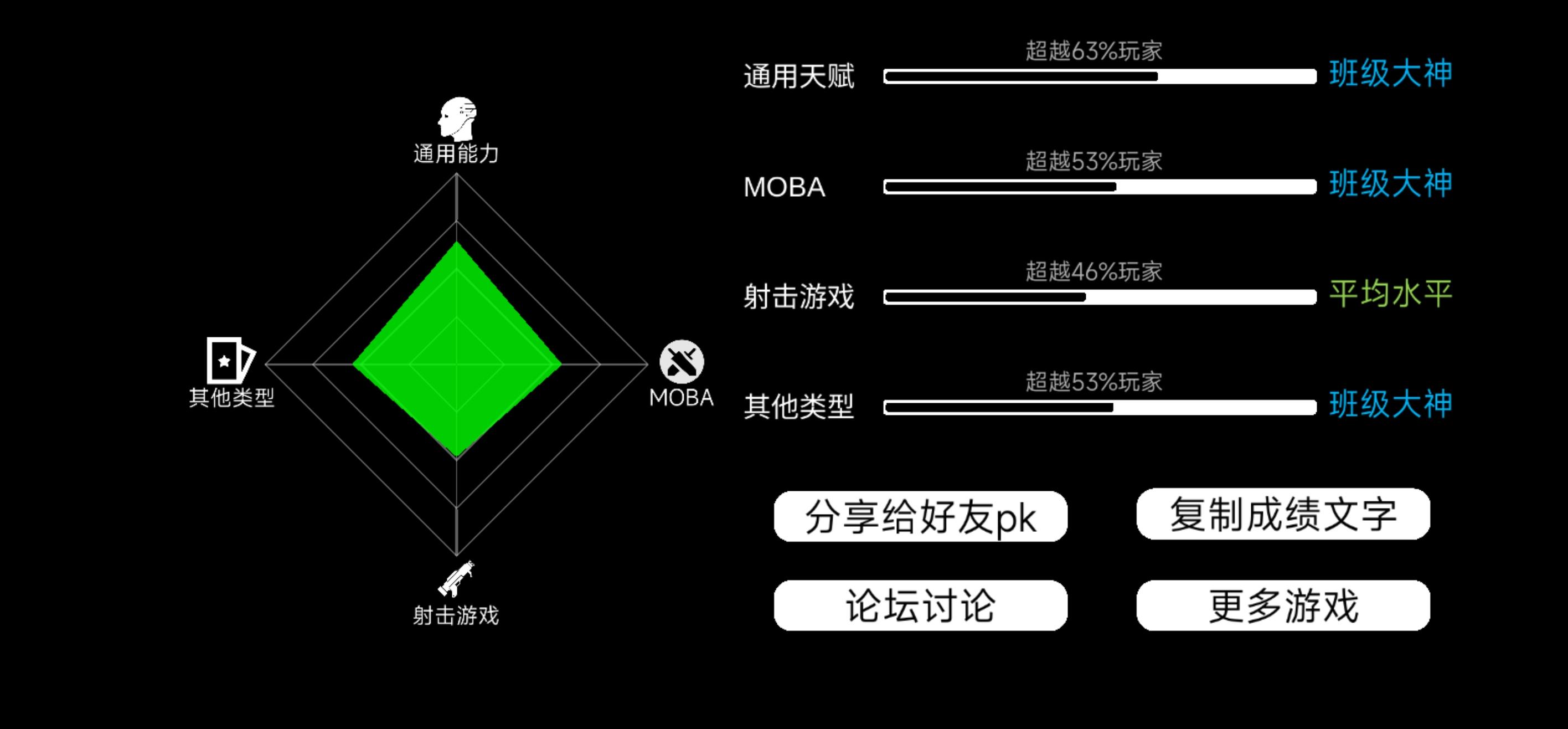 我在[我的游戏天赋]中的成绩:通用能力超越91%玩家 -相当于职业选手MOBA游戏超越99%玩家 -相当于职业选手射击游戏超越97%玩家 -相当于职业选手其他类型超越95%玩家 -相当于职业选手你也来试试吧https://www.taptap.com/app/223782