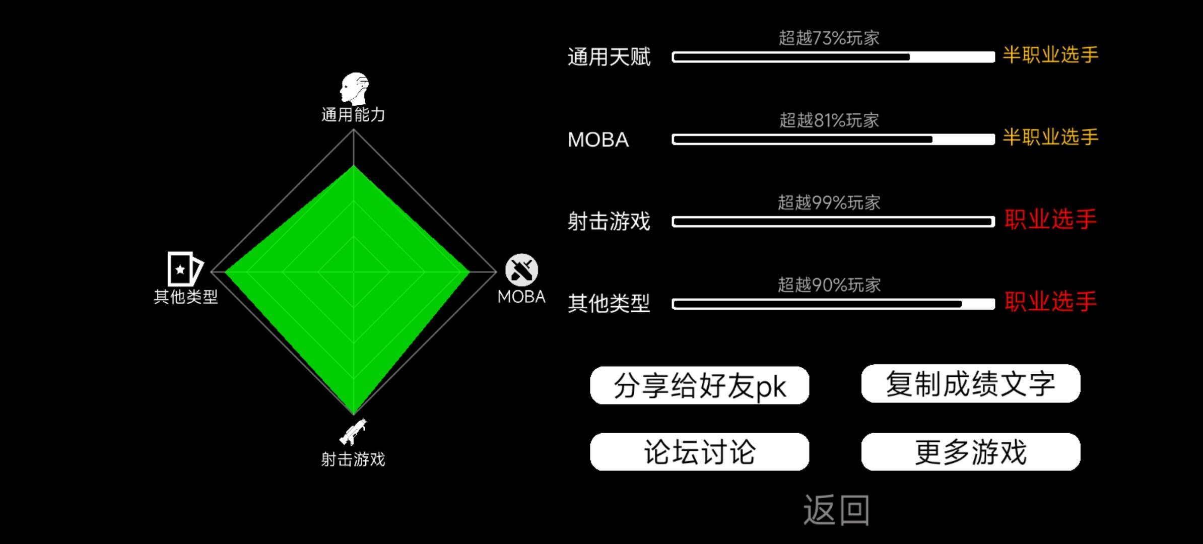 我在[我的游戏天赋]中的成绩:通用能力超越73%玩家 -相当于半职业选手MOBA游戏超越81%玩家 -相当于半职业选手射击游戏超越99%玩家 -相当于职业选手其他类型超越90%玩家 -相当于半职业选手🤣