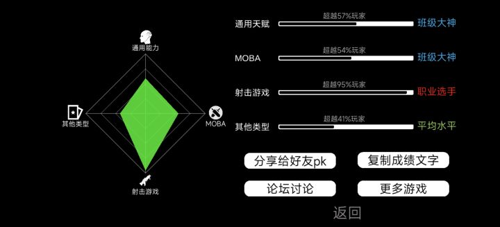 我在[我的游戏天赋]中的成绩:通用能力超越73%玩家 -相当于半职业选手MOBA游戏超越81%玩家 -相当于半职业选手射击游戏超越99%玩家 -相当于职业选手其他类型超越90%玩家 -相当于半职业选手🤣