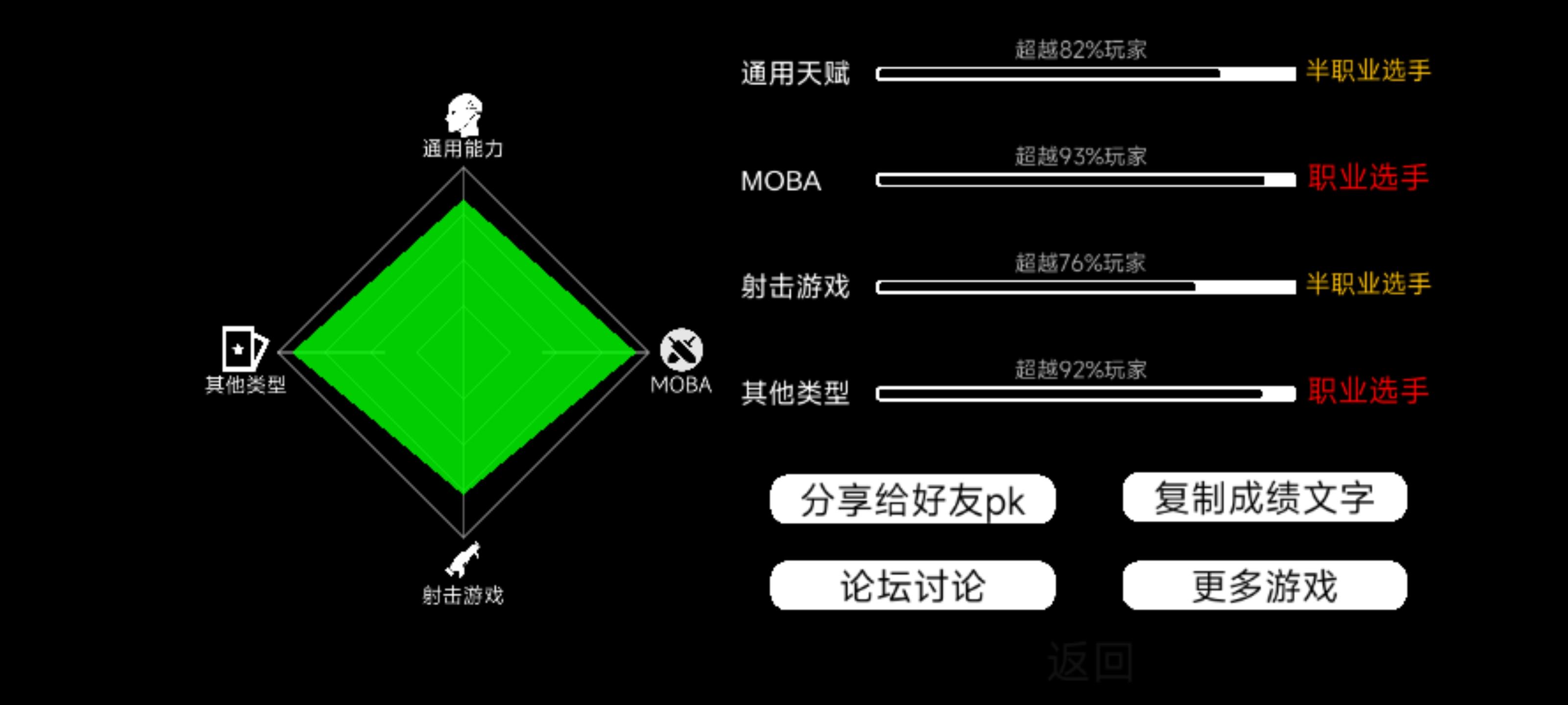 我在[我的游戏天赋]中的成绩:通用能力超越91%玩家 -相当于职业选手MOBA游戏超越99%玩家 -相当于职业选手射击游戏超越97%玩家 -相当于职业选手其他类型超越95%玩家 -相当于职业选手你也来试试吧https://www.taptap.com/app/223782