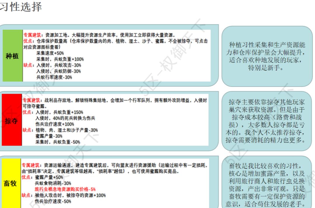 在前面提到了习性建筑可以共存且发挥被动加成,这里再提一点 关于习性的较优选择 第一次习性建议: t0畜牧/t1种田/大傻子 掠劫 理由: 作为战略性资源,蜜露不可运输也不可快收,蜜露的产量仅以技能们和蚜虫数量,工蚁数量相关。而在商店之前,会特别缺;蜜露的足量供应,与前期建筑的低资源需求能让你迅速发展 若不缺蜜露(快速开出商店)可以选择种地,不过可能会导致长期的被动囤蜜 对了,别忘了看看畜牧特殊商店