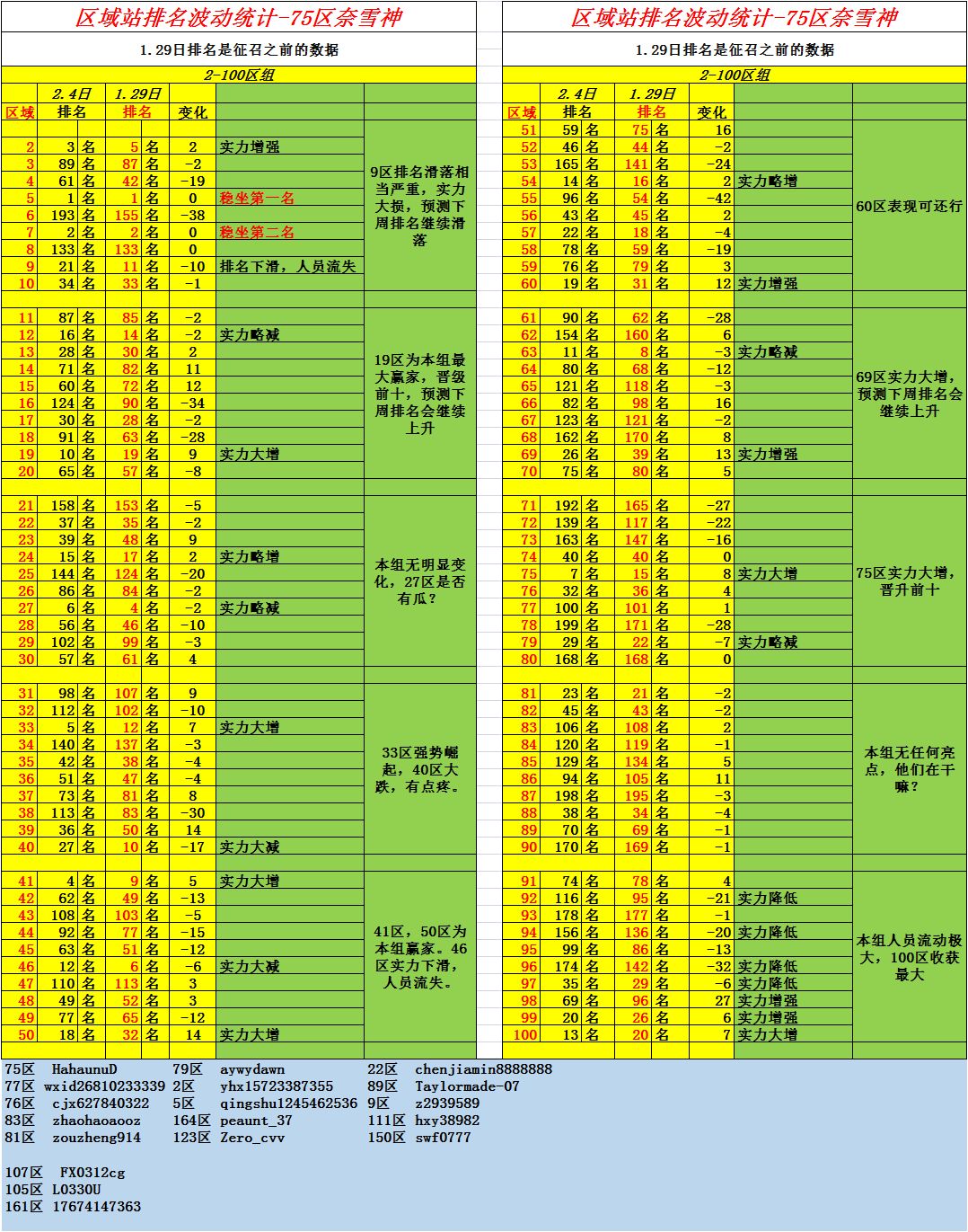1.29日排名为上周,未开跨区召集。2.4日为本周,跨区召集即将结束。本表详细统计了排名变更,粗略反应每个区域的实力变化。由于2.4数据为13天的总排名,数据略有误差,因此仅供参考。