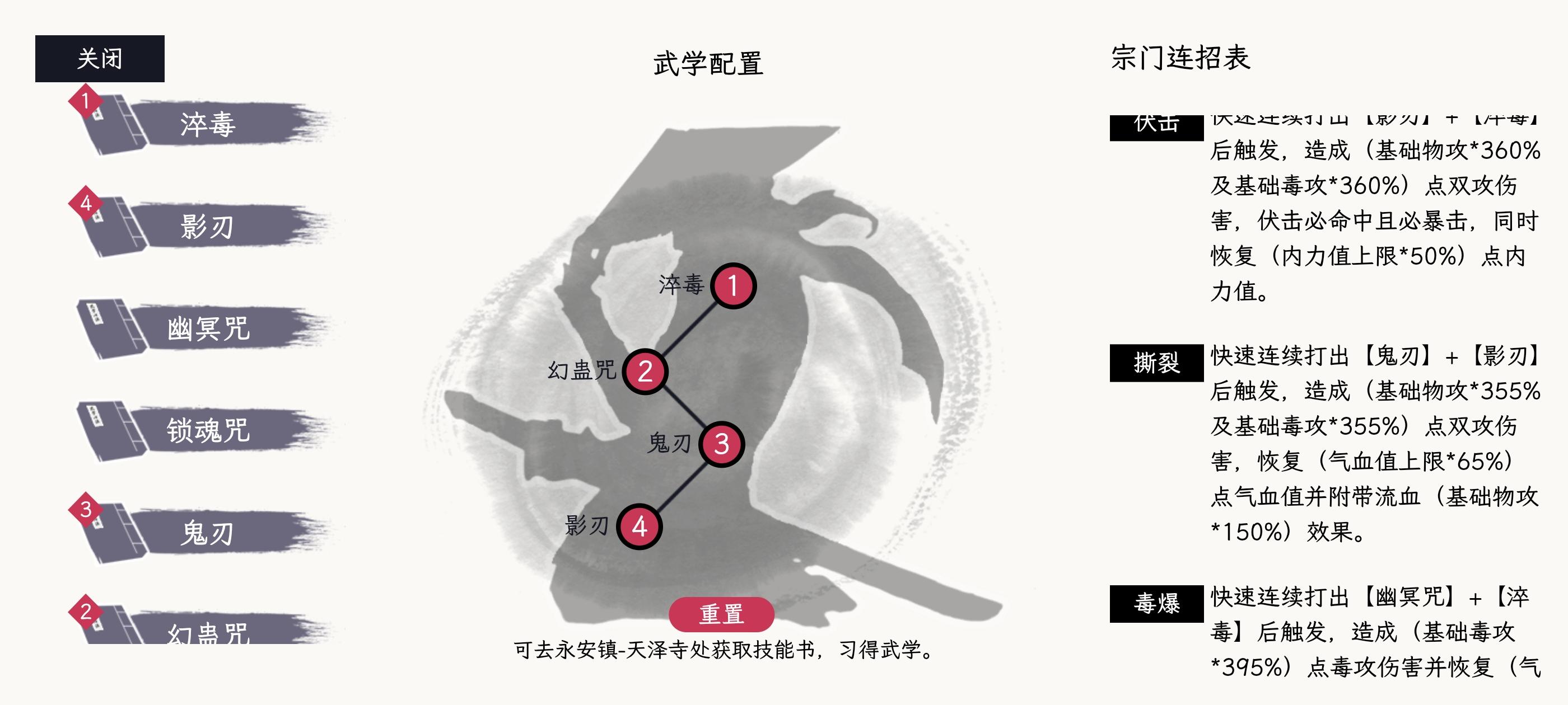 核心是封魔四件套(建宗门,结交圣蛇教灵坛)+肉剑无妄(论坛里面有怎么获取)+毒师连招带的55%免伤和一次35%一次65%的回血+羽刃持续伤害。接下来最重要的手法,第一波按顺序全按,后面12/34慢慢循环或者有机会也可以全按(全按可能被控一波带走)。由于不知道什么原因,有时候连招会不触发效果,经过我多次尝试,以上技能是我目前为止最稳定触发的。毒师蓝条短,这套技能比较耗蓝,郎中那里买药就能满足。目