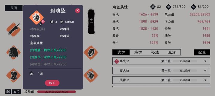 开宗之后就开始跑图刷其余宗门好感,给的装备非常nice,就是跑图刷材料费时间武器防具首饰啥都有机会给,我这几个封魔的装备都是最后一张图上两个地方给的,要不是给了一个女装衣服四件套就齐了