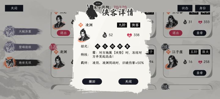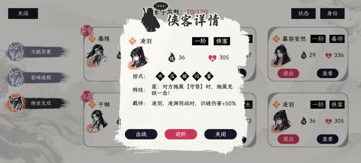 - 接上回前言:新手创立宗门招生详章了解之后接下来绕不开的话题就是培养弟子建议在一级宗门里面先培养每一个身份的弟子都培养到4阶之后再去升级二级宗门。那么,弟子应该怎么判断价值?弟子面板:打开弟子界面1.品级: 与弟子获取时侠义声望限制相关, 蓝300,紫500,橙10002.阶位: 弟子目前阶位等级,与弟子的攻击和血量和能胜任的宗门事务相关3.身份: 与功能性相关,如战斗