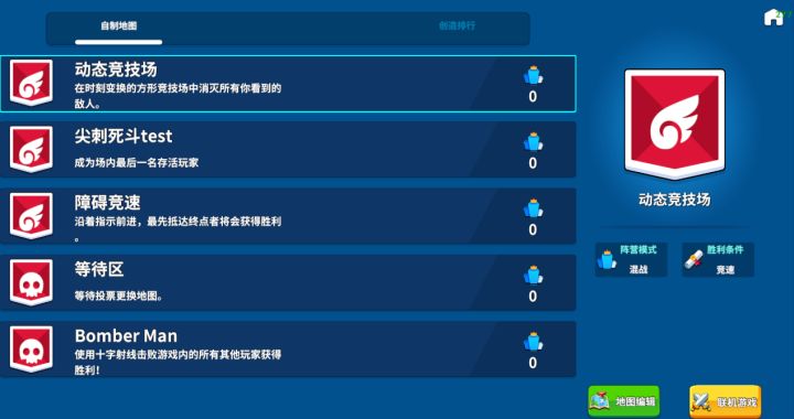 游戏简介地牢建造者是一款支持玩家设计自定义地牢并与其他玩家在其中探险的游戏,游戏提供了32x32的场景格数,玩家可以将场景格设置为伤害性,强制位移等类型的机关,同时每个地图的物理参数,胜负规则也已开放。基础规则说明(1)在主界面中选中任意一个地图存档,随后点击编辑模式即可开始编辑该地图存档。(2)单机测试同上,允许玩家在只有自身1人的匹配环境下测试地图的功能。(3)“加入战斗”加入战斗功