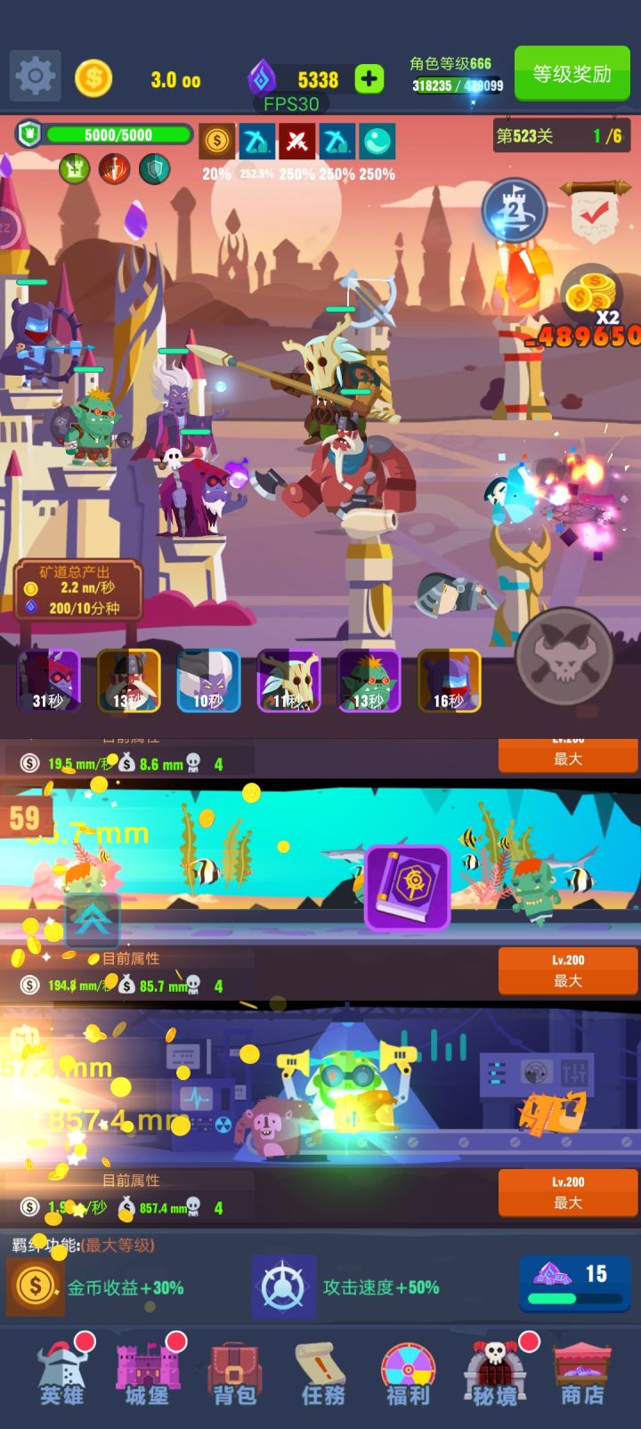 2)游戏整个框架相对不大,城堡分阶段开放3个技能,升级提高技能效果和冷却时间,城堡50级开6槽位,需要大概3-4天时间。随着坑道进度会提供BUFF效果,可以用金币升级,坑道的等级也会关联羁绊效果,也需要金币升级。游戏的体验就像开车一样,开得快油就用得快,开得慢油就需求少,反正最后的终点一定能到,早晚而已。