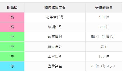 如何有效地收集宝石优先级如何收集宝石获得的数量高初学者任务450 件高培训任务800 件中故事清晰50 件(1 清除)中每日任务五个中正常任务150 件低登录奖金25 件(每 4 天)完成初学者任务完成初学者任务后,将完成任务作为首要任务。任务内容类似于教程的延伸,因此您将能够在不到一小时的时间内完成所有任务。完成培训任务完成所有初学者任务后,下一步是时候完成训练任务了。与初学者任务相比,这是