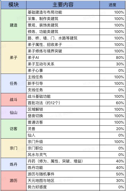 各位道友: 大家好! 最近小道童收到大家最频繁的问题就是“什么时候测试?” 我们也想尽快和大家见面,不过目前的游戏内容和品质还不足以给大家一个好的体验。 但是!我们真的没有刚建文件夹,也不会跑路的! 所以今天就来和大家披露一下我们首测版本的进度,之后每隔一段时间也会更新一次,这样大家就能更清晰透明地监工了~ ===========进度披露========== 今天的进度就披露到这里啦,后续也会为各