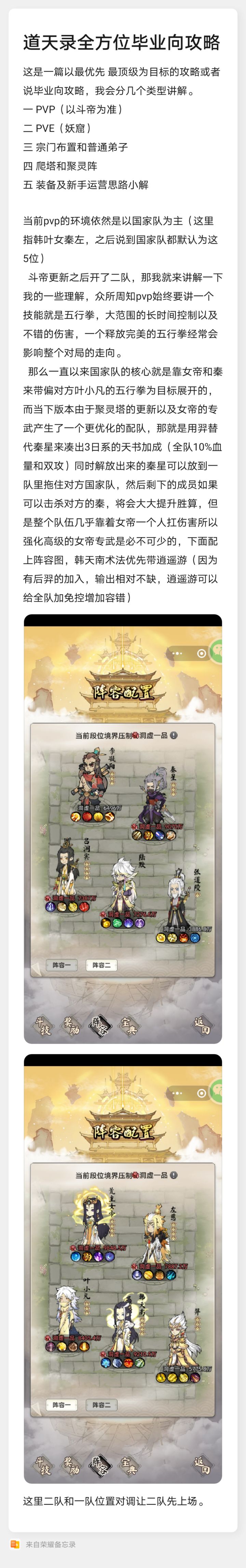 哈喽,各位道友朋友们大家好。本期小编来说说主流阵容技能搭配及神通强化内容,感兴趣的小伙伴就跟着小编一起来看看吧。本文首发【道天营地】公众号,未经授权禁止“抄袭文章“转载至其它平台。主流阵容技能目前主流阵容为韩天南、左慈、荒主女帝、叶小凡、秦星。韩天南技能搭配:氪金版:彤云卷日+五行通神决+朱雀引火+蟠龙剑阵平民版:彤云卷日+百花心经+朱雀引火+蟠龙剑阵荒主女帝技能搭配:冰灵术+象甲